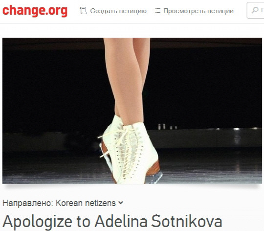 러시아 네티즌들은 최근 인권회복 청원 사이트 체인지(Change)에 '한국인들 아델리나 소트니코바에 사과하라'는 내용의 청원글을 올리며 서명운동을 진행 중이다.