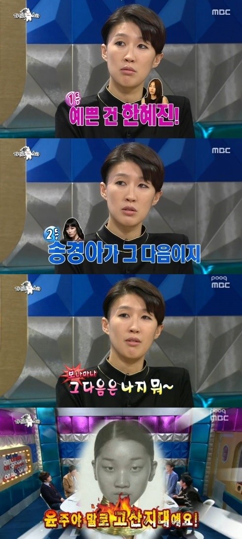 홍진경이 모델 외모순위 1위로 한혜진을 꼽았다.지난 26일 방송된 MBC '황금어장-라디오스타'에는 '단추 구멍' 특집으로 홍진경, 개그맨 윤형빈, 박휘순, 가수 이민우, 가인이 출연해 거침없는 입담을 뽐냈다.이날 MC 규현은 "모델 장윤주, 송경아, 한혜진과 비교하면 외모로 1등은 누군가?"라는 질문에 홍진경은 "한혜진이 제일 예쁘다. 두 번째는 송경아. 그 다음은 나지 뭐"라고 답했다.이어 "그럼 장윤주는 정말 아닌가?"라고 말하자 홍진경은 "걔야 말로 고산지대형 얼굴이다. 목에 링 끼우면 딱이다"고 장윤주 외모를 디스해 폭소를 자아냈다.또한, MC들이 "장윤주와 통화는 하느냐?"고 묻자 홍진경은 아무렇지 않게 "안 한다"고 답해 주위를 웃음바다로 만들었다.[홍진경 한혜진 언급, 사진=MBC '라디오스타' 방송 캡처]