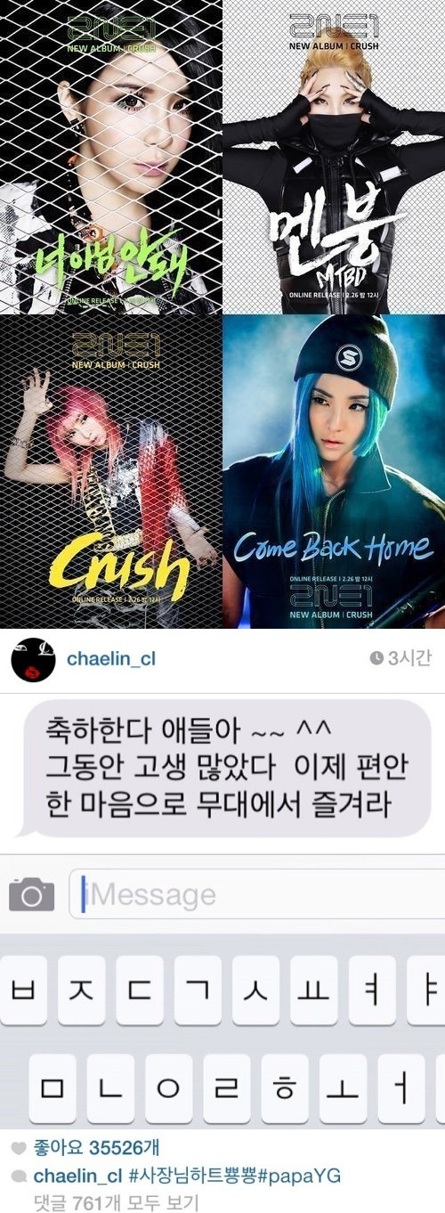 걸그룹 2NE1의 씨엘(CL)이 YG 양현석으로부터 받은 문자메시지를 공개했다.2NE1 씨엘은 27일 자신의 인스타그램에 "사장님 하트 뿅뿅. papa YG"라는 글과 함께 YG엔터테인먼트 양현석 대표가 보낸 문자를 캡처한 사진을 올렸다.공개된 양현석 문자에는 "축하한다, 얘들아. 그동안 고생 많았다. 이제 편안한 마음으로 무대에서 즐겨라"라는 격려의 내용이 담겨 있다.앞서 27일 자정 공개된 2NE1 '컴백홈'은 공개되자마자 포털사이트 실시간 검색어 1위 달성은 물론 음원 차트를 폭격, 1위를 싹쓸이했다. 수록곡 역시 최상위권에 포진하며 줄세우기에 성공, 음원강자 2NE1의 저력을 과시했다.타이틀곡 '컴백홈'(COME BACK HOME)은 YG 메인 프로듀서인 테디와 소속 프로듀서들의 공동 작품으로 R&B, 레게, 힙합의 여러 장르를 접목시킨 크로스오버 장르의 댄스곡이다.한편, 2NE1은 3월 1일 서울 올림픽 체육관에서 열리는 월드투어 'ALL OR NOTHING' 서울공연에서 정규 2집의 신곡 무대를 처음으로 선보인다.[2NE1 양현석 문자 공개, 사진=YG엔터테인먼트/씨엘 인스타그램]