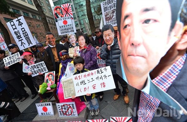미래지향적인 한일관계 형성을 위해 과거사에 대한 진정성 있는 사죄를 요구했다.또 일본 아베 총리, NHK 모이이 회장, 에토 세이이치 참의원 등의 가면을 쓰고