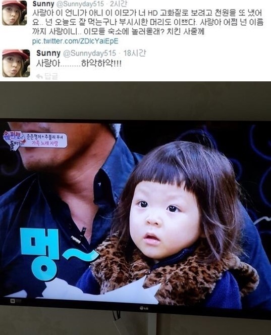 써니는 지난 2월 28일 자신의 트위터에 "사랑아, 이 언니가, 아니 이모가 너 HD 고화질로 보려고 천원을 또 냈어요"라는 글과 함께 KBS2 '슈퍼맨이 돌아왔다' 화면을 캡처한 사진을 올렸다.