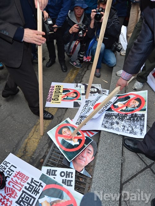 미래지향적인 한일관계 형성을 위해 과거사에 대한 진정성 있는 사죄를 요구했다.또 일본 아베 총리, NHK 모이이 회장, 에토 세이이치 참의원 등의 가면을 쓰고