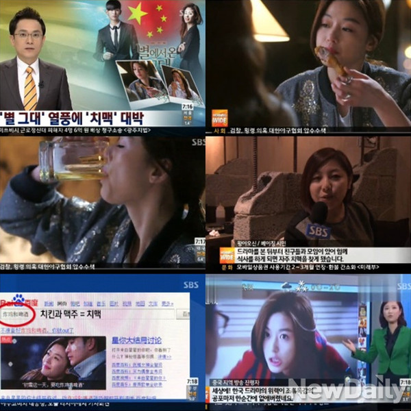 중국에서 치맥 열풍이 불고 있다.지난 2월 27일 화제 속에 막을 내린 SBS 수목드라마 '별에서 온 그대'(이하 별그대)의 인기가 국내를 넘어 중국을 뒤흔들었다.'별그대'에서 여주인공 천송이(전지현)가 치맥(치킨+맥주)을 먹는 장면이 자주 등장하면서 중국에서도 치맥 인기가 높아지고 있다.28일 방송된 SBS '8시뉴스'에서는 '중국 치맥 열풍'에 대해 소개했다. 보도에 따르면 상하이에서는 한국식 치킨을 사기 위해 3시간 넘게 줄을 서야 하고, 중국어로 '치맥'은 인기 검색어 대접을 받는다.중국에서는 맥주 안주로 치킨을 즐기지 않는 것으로 알려졌다. 하지만 '별그대'가 중국에서 얼마나 인기를 얻고 있는지 치맥 열풍이 고스란히 보여준다.이에 중국 현지의 한국식 치킨집은 때 아닌 호황을 맞고 있다. 중국 치맥 열풍은 좋은 문화 콘텐츠가 한류 확산의 첨병 노릇을 할 뿐 아니라 막대한 경제적 이익도 가져다 준다는 점을 다시 한번 증명했다.중국 치맥 열풍 소식을 접한 네티즌들은 "중국 치맥 열풍 별그대 인기 실감", "전지현 치킨 CF 들어올 듯", "중국 치맥 열풍 한류 식지 않았구나", "중국이 이제야 치맥의 참맛을 알아군요", "중국 치맥 열풍 전지현 효과?" 등의 반응을 보였다.[중국 치맥 열풍, 사진=SBS '8시뉴스' 방송 캡처]