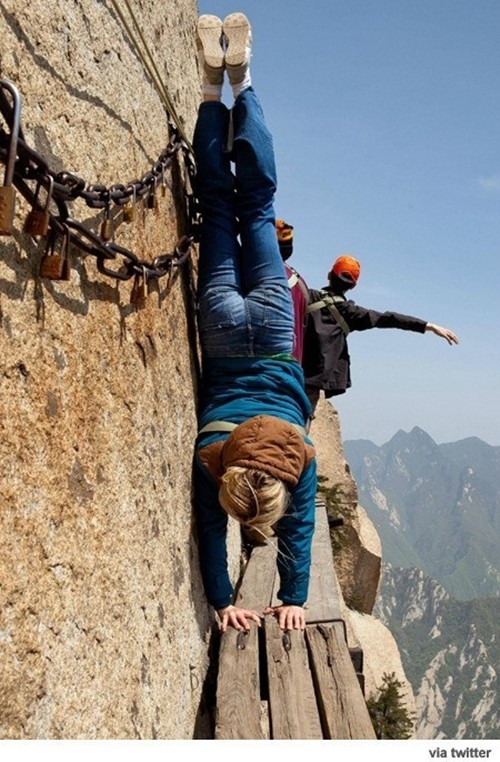 가장 용감한 여성 관광객이 공개됐다.최근 각종 온라인 커뮤니티 게시판에는 [가장 용감한 여성 관광객]이라는 제목으로 한 장의 사진이 올라왔다.공개된 사진 속 한 외국인 여성은 아찔한 높이의 좁은 발판에서 안전장치 없이 물구나무를 서고 있다. 여성이 물구나무 서기를 한 곳은 중국 산시성의 화산으로 알려졌다.특히, 바로 옆에는 절벽이기 때문에 조금만 실수를 해도 떨어지는 상황이라 보는 이들의 놀라움을 자아낸다. 이에 네티즌들은 '가장 용감한 여성 관광객'이라는 제목을 붙인 것으로 보인다.'가장 용감한 여성 관광객' 사진을 접한 네티즌들은 "가장 용감한 여성 관광객 대단하다", "안전줄 매고 묘기 부린 거겠지", "가장 용감한 여성 관광객 정체가 뭐야?", "보기만 해도 가슴이 조마조마~", "가장 용감한 여성 관광객 강심장이네" 등의 반응을 보였다.[가장 용감한 여성 관광객, 사진=온라인 커뮤니티]