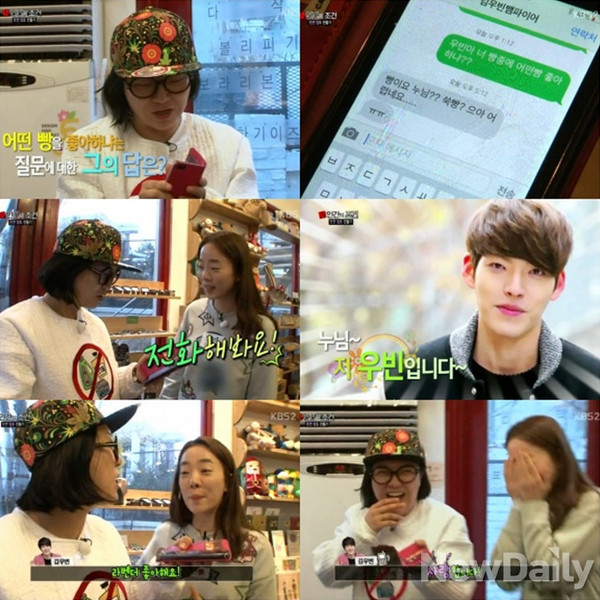 김숙이 김우빈과 주고 받은 문자를 공개해 화제다.김숙은 지난 3월 1일 방송된 KBS 2TV '인간의 조건'에서 김우빈과의 문자를 공개하며 의외의 친분을 과시했다. 두 사람은 과거 MBN 시트콤 '뱀파이어 아이돌'에 함께 출연해 인연을 맺은 바 있다.이날 김숙은 박은영 아나운서와 함께 천연양초를 만들러 가던 중 어떤 빵을 좋아하냐고 문자로 물었다. 이에 김우빈은 "쑥빵? 으아 어렵네요..ㅠ"라고 귀여운 답을 보내 김숙과 박은영을 설레게 했다.이후 전화 통화에서도 김우빈은 "누나들 힘내세요. 사랑합니다"라고 애교 넘치는 응원을 전해 보는 훈훈함을 자아냈다.김숙 김우빈 문자를 접한 네티즌들은 "김숙 김우빈 문자 부러워", "김숙 김우빈 문자에 전화까지 하는 사이였어?", "김숙 김우빈 문자 친분 인증 제대로~", "박은영 표정 정말 리얼이야", "김숙 김우빈 문자 완전 달달해" 등의 반응을 보였다.[김숙 김우빈 문자, 사진=KBS2 '인간의 조건' 방송 캡처]