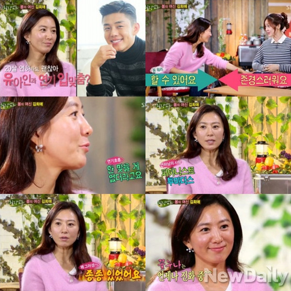 배우 김희애가 19살 연하 유아인과 연인 호흡을 맞추는 소감을 전했다.김희애는 지난 3일 방송된 SBS '힐링캠프, 기쁘지 아니한가'(이하 힐링캠프)에 출연해 배우 유아인과 멜로연기를 하는 것에 대해 솔직하게 털어놨다.이날 MC 성유리가 "유아인과 멜로 연기를 한다. 존경스럽다"라고 언급하자 김희애는 성유리를 향해 "할 수 있다"고 답해 웃음을 자아냈다.이어 연기 호흡이 잘 맞냐는 질문에 김희애는 "안 맞을 게 없더라. 영화 '투마더스', '피아니스트'.. 생각해 봐라. 종종 연하남과 연상녀의 이야기를 그린 작품은 있었다"고 설명했다.또한, 김희애는 "20~30대 땐 연기를 시키면 하고 그랬는데, 지금은 70, 80세까지 연기할 것 같다"고 말했다. 이에 성유리는 "유아인 씨 때문인가요?"라고 물었고, 김희애는 "제 친구들이 사심 연기하지 말라고 했다"고 밝혔다.[김희애 유아인 언급, 사진=SBS '힐링캠프' 방송 캡처]