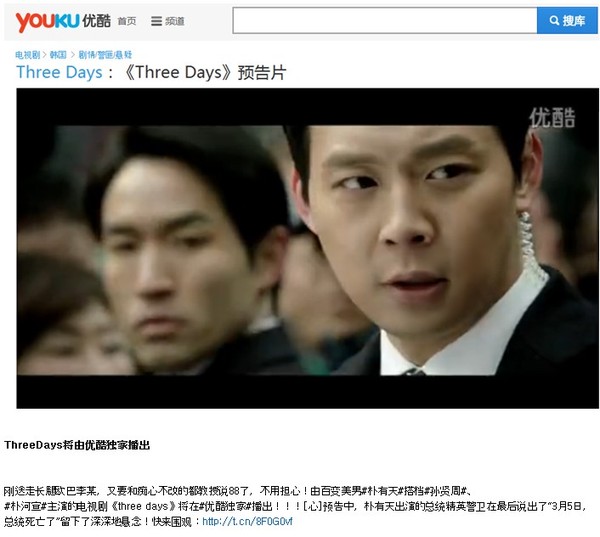 ‘쓰리데이즈’가 중국 시장에 진출하는 한국 드라마의 역사를 새로 썼다.SBS 새 수목드라마 ‘쓰리데이즈’ (김은희 극본, 신경수)는 역대 최고가로 중국에 수출됐다. 최근 중국에 최고가로 팔렸던 SBS ‘별에서 온 그대’의 회당 금액을 뛰어넘으며 ‘쓰리데이즈’에 대한 높은 관심을 드러냈다.제작사 골든썸픽쳐스 김용훈 대표는 “그 동안 중국 시장에서는 회당 1만 달러도 되지 않는 금액을 제시했었다. 하지만 ‘쓰리데이즈’는 그 5배에 육박하는 금액에 판매됐다. 확인 결과 공식적으로 역대 수출된 한국 드라마 중 최고가였다”고 밝혔다.‘쓰리데이즈’의 판권을 구매한 곳은 중국 최대 동영상 사이트 유쿠(youku)다. 중국 내에서 가장 많은 가입자와 접속자 수를 자랑하는 곳인 만큼 ‘쓰리데이즈’가 시작되면 중국 내 또 한번 강력한 한류가 휘몰아칠 전망이다.‘쓰리데이즈’의 판권 최고가 경신은 최근 일본 시장이 침체되며 주춤했던 한류를 되살리는 계기가 될 것으로 보인다. 그 중심에는 배우 박유천이 있다. 일본에서 최고의 한류스타로 각광받고 있는 박유천은 그 기세를 중국으로 이어가며 좁았던 중국 시장의 문을 활짝 열었다.제작사 측은 “일본의 우경화와 엔저 등으로 한국 드라마에 대한 수요도 줄어들고 판권 금액도 하락했다. 이런 공백을 중국 시장을 통해 메울 수 있게 됐다. 그 중심에는 전세계를 무대로 활동하는 박유천과 같은 한류스타와 한국 드라마 제작사들의 탄탄한 콘텐츠가 버티고 있다”고 전했다.‘쓰리데이즈’는 ‘싸인’, ‘유령’ 등 장르물을 연이어 성공시켜 ‘한국형 미드’의 1인자로 불리는 김은희 작가와 ‘뿌리깊은 나무’의 신경수 PD가 1년 반에 걸쳐 기획한 작품이다. 100억 원이 넘는 제작비가 투입된 대작으로 초호화 캐스팅과 최강 제작진의 만남으로 기대를 모으고 있다.SBS 새 수목드라마 ‘쓰리데이즈’는 ‘별에서 온 그대’를 후속해 3월 5일 밤 10시 첫 방송된다.[사진=골든썸픽쳐스]