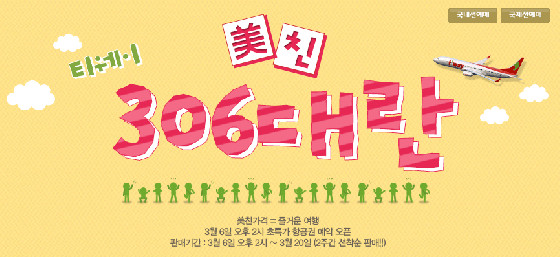 항공사 티웨이항공이 '美친 306대란' 특가 항공권 예약 이벤트를 실시한다.티웨이항공은 공식 홈페이지를 통해 '美친 306대란' 이벤트 소식을 알렸다.이번 행사는 6일 오후 2시부터 20일까지 2주간 진행되는 할인 이벤트로 4월과 5월 항공권을 특별할인가격으로 제공한다.이번 이벤트에서 티웨이항공은 5월1일부터 5월31일까지 김포-제주, 대구-제주 노선 편도 운임비를 최저 2만6000원에 제공한다.또한 해외노선도 할인행사에 포함돼 있어 더욱 관심을 모으고 있다. 인천-후쿠오카 노선 5만9000원(5월7일~31일), 인천-삿포로 9만9000원(3월30일~5월31일), 인천-방콕 15만5600원(4월1일~5월31일), 김포-타이베이(송산) 15만300원(5월 7일~31일) 등 저렴한 가격으로 제공한다.더욱 자세한 내용은 티웨이항공 홈페이지를 통해 확인 가능하다.한편, 티웨이항공 할인 소식을 접한 네티즌들은 "티웨이항공, 대박이네" "티웨이항공, 꼭 사야겠다" "티웨이항공, 일본 짱 싸다" "티웨이항공, 시간이 안된다" 등의 반응을 보였다.[사진 출처=티웨이항공 공식 홈페이지]