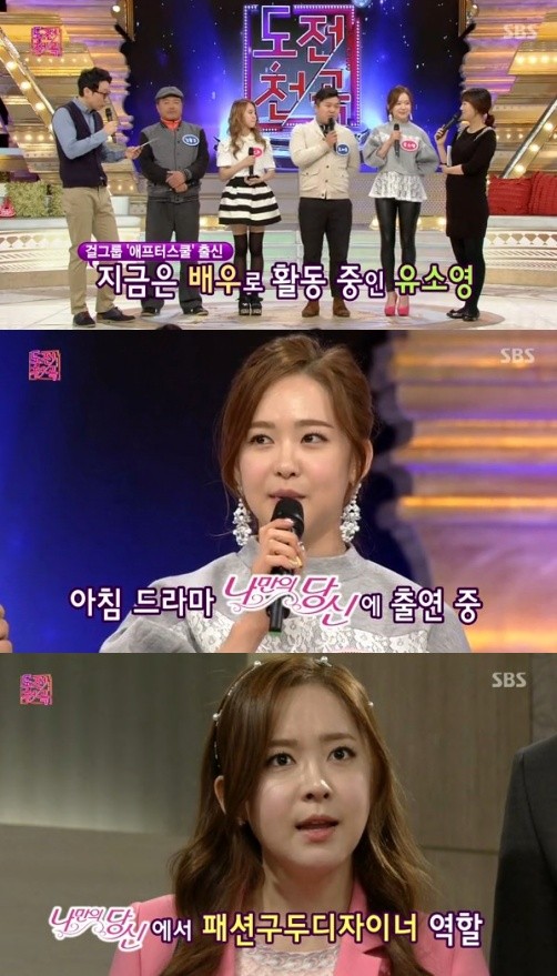 걸그룹 애프터스쿨 전 멤버 유소영이 근황을 전했다.9일 오전 방송된 SBS '도전천곡'에는 김흥국, 성진우, 신지, 이재포, 유소영, 김소정, 갓세븐, 앤씨아 등이 출연해 노래 대결을 펼쳤다.이날 MC 이휘재는 유소영이 스튜디오 가운데에 등장하자 "금의환향이라고 할 수 있겠다"고 말했다. 유소영은 지난 2009년 애프터스쿨을 탈퇴해 최근 연기자로 전향했다.유소영은 "현재 아침드라마 '나만의 당신'에 출연하고 있다. 패션 구두 디자이너 역할이다. 드라마 많이 봐주셨으면 좋겠다"라고 근황을 밝혔다.현재 유소영은 SBS 일일드라마 '나만의 당신'에서 강성아 역으로 출연 중이다.유소영 근황을 접한 네티즌들은 "유소영 근황 반가워", "배우로서 앞으로 활동 기대할게요!", "유소영 근황 전에도 드라마 나오지 않았나?", "안 본 사이 미모 물 올랐네", "유소영 근황 더 예뻐졌다" 등의 반응을 보였다.[유소영 근황, 사진=SBS '도전천곡' 방송 캡처]