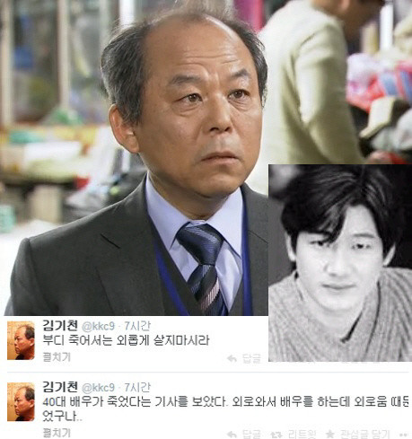 배우 김기천이 고(故) 우봉식을 애도했다.김기천은 11일 자신의 트위터에 "40대 배우가 죽었다는 기사를 봤다. 외로워 배우를 하는데 외로움 때문에 죽었구나. 부디 죽어서는 외롭게 살지 마라"라는 글을 남겼다.김기천은 지난해 KBS2 월화드라마 '직장의 신'에서 고과장으로 시청자들에게 얼굴을 알렸으며, SBS '결혼의 여신' 노희봉 역, 영화 '롤러코스터' 하승복 회자 역 등을 맡았다.경찰에 따르면 우봉식은 지난 9일 오후 9시께 서울 강남구 자택에서 목을 매 숨진 발견됐다. 조사 결과 우봉식은 이미 하루 전 세상을 떠난 상태였다.당시 우봉식의 지인은 고인의 집이 잠겨 있는 걸 확인하고 주인집을 통해 문을 열고 안에 들어갔다 숨진 사실을 확인했다.이 지인은 고인이 몇 해 전부터 극심한 우울증으로 신경과 치료를 받으며 약을 먹기 시작했고, 오랜 기간 생활고에 시달려왔다고 증언했다.1983년 MBC 드라마 '3840유격대'를 통해 데뷔한 우봉식은 안양예고를 졸업했으며, 영화 '6월의 일기', '싸이렌', '플라스틱 트리', '사랑하니까, 괜찮아', 드라마 '대조영' 등에 출연했다.[김기천 사진=KBS2 '직장의 신' 방송 캡처/김기천 트위터 캡처]