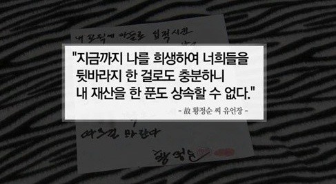 유서의 골자는 "(고인의 남편과 전처가 낳은)양아들 이 모 씨 측에 단 한 푼의 유산도 상속할 수 없다"는 내용이었다.지금까지 나를 희생해
