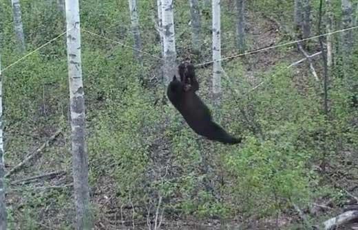 로프 타는 흑곰이 포착됐다.최근 한 온라인 커뮤니티 게시판에는 '로프 타는 흑곰'이라는 제목으로 영상이 게재돼 네티즌들의 눈길을 모았다.공개된 영상은 팻 카렛이라는 이름의 남자가 캐나다 앨버타주 브레톤이라는 수렵지역에서 1년 전 촬영된 것으로 알려졌다.영상 속 흑곰은 나무에 올라 얇은 로프를 타고 아슬아슬하게 이동하고 있다. 흑곰이 위험을 무릅쓰고 로프를 탄 이유는 매달린 검은 비닐봉투 안에 음식이 들어있었기 때문이다.흑곰은 로프를 타고 봉투 앞까지 도달했지만, 그만 땅으로 떨어지며 아쉽게 먹이를 먹지 못했다.'로프 타는 흑곰 포착' 영상을 접한 네티즌들은 "로프 타는 흑곰 포착 크게 안 다쳤을까?", "곰이 재주 부리는 듯", "로프 타는 흑곰 포착 신기하다", "음식 앞에서는 겁도 없구나", "로프 타는 흑곰 포착 떨어질 때 많이 아프겠다", "진짜사니이 유격 하는 것 같아" 등의 반응을 보였다.[로프 타는 흑곰 포착, 사진=온라인 커뮤니티]