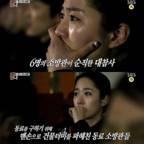 이 영상을 본 전혜빈은 "내 앞에서 대원들이 투입된 건물이 무너진 것을 본 심정은 어땠을까 하는 생각이 든다"며 "'불법 주 정차된 차들만 없었어도' 라는 생각을 계속 하게 된다"고 말을 이은 후, 눈물을 흘렸다.