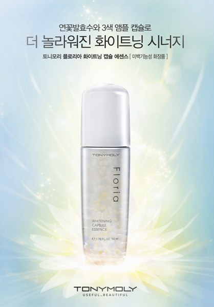 ▲ 토니모리 [플로리아 화이트닝 캡슐 에센스]<토니모리(사장 정의훈)>는 2번 발효한 연꽃수와 3색 앰플 캡슐 성분으로,