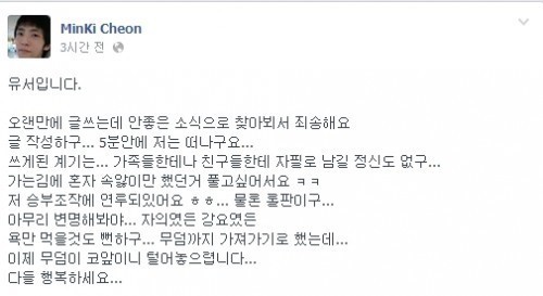 천민기는 13일 오전 자신의 페이스북에 "유서입니다"라며 "오랜만에 글 쓰는데 안 좋은 소식으로 찾아봬서 죄송해요. 글 작성하고 5분 안에 저는 떠나고요. 쓰게 된 계기는 가족들한테나 친구들한테 자필로 남길 정신도 없고 가는 김에 혼자 속앓이만 했던 거 풀고 싶어서요"라고 말했다.