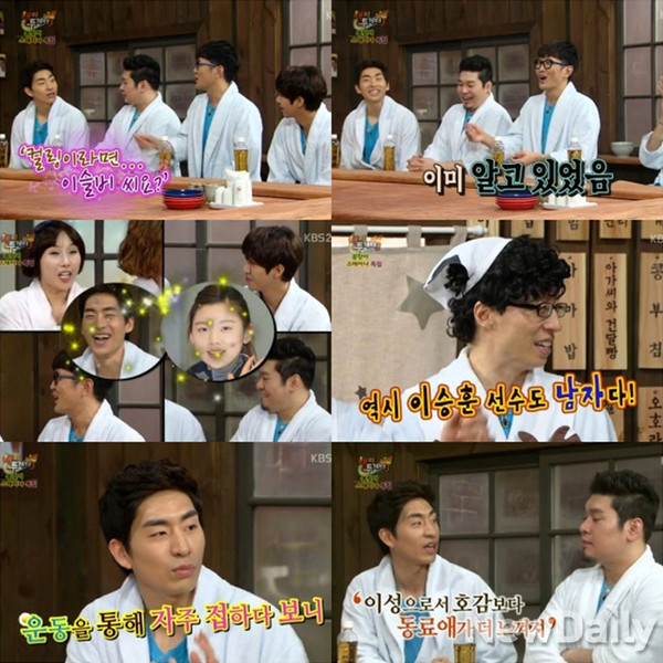 '해투3' 이승훈(27)이 미녀 빙상 선수들에게 호감을 드러냈다.지난 13일 방송된 KBS 2TV '해피투게더3'에서는 봄밪이 스태미너 특집으로 스피드스케이팅 선수 이승훈, 레이먼킴, 개그맨 윤형빈, 제국의 아이들의 광희가 출연해 솔직한 입담을 뽐냈다.이날 MC들은 박승희, 이한빈 선수를 언급하며 "선수촌에서도 사랑을 많이 하지 않냐. 컬링에 그 예쁜 선수 있지 않느냐"고 말을 꺼냈다.이에 이승훈은 "아 이슬비 씨요?"라고 실명을 밝혔고, MC 유재석은 "역시 이승훈도 남자"라고 핑크빛 분위기로 몰아갔다.주위의 반응이 이슬비와 엮어주려고 하자 이승훈은 "운동을 통해 자주 접하다 보니 이성으로서의 호감보다 동료애가 느껴진다"고 말했다.이어 이승훈은 미국의 피겨선수 그레이시 골드에 대한 이야기가 나오자 화색을 띠며 "숙소에서 모태범 선수와 같이 봤는데 그 선수는 눈에 좀 띄더라"고 속내를 고백했다.이에 MC들은 "(그레이시 골드)경기 보면서 무슨 생각했냐"고 물었고, 이승훈은 "어우..쟤..잘 하겠다. 잘 하면 정말 뜨겠다고 생각했다"며 말을 더듬었다.[해투3 이승훈 이슬비 언급, 사진=KBS2 '해피투게더' 방송 캡처]