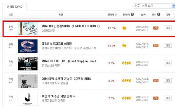 소속사 측에 따르면 신승훈이 5년 만에 개최하는 한정판 극장식 공연 'THE 신승훈SHOW - LIMITED EDITION Ⅱ'가 티켓 오픈 당일(14일) 전석 매진을 기록하며 실시간 예매차트 1위에 오른 것으로 전해졌다.