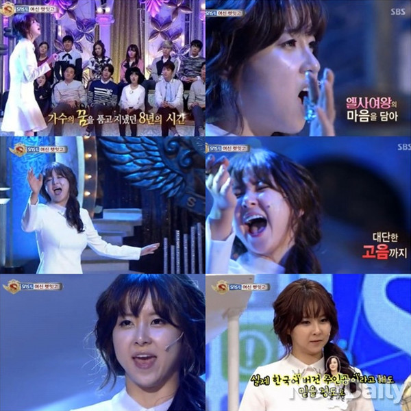 SNS 스타 은가은이 '스타킹'에 출연해 감동의 무대를 선사했다.15일 방송된 SBS '놀라운 대회 스타킹'에서는 애니메이션 '겨울왕국' OST '렛잇고(Let it go)' 패러디 무대가 펼쳐졌다.이날 SNS상에서 '렛잇고'를 커버해 큰 인기를 끈 은가은이 '여신 렛잇고'로 등장해 출중한 외모와 함께 뛰어난 가창력을 과시했다.은가은은 "8년째 연습생이다. 15년 넘게 노래를 부를 수 있는 무대를 꿈꿔왔는데 이제 그 소망을 이룬 것 같다"며 눈물을 흘렸다.이에 은가은 '렛잇고' 무대를 본 박해미는 "내가 준비 중인 뮤지컬이 있는데, 그 작품 여주인공으로 캐스팅하고 싶다"고 밝혔다.'스타킹 여신 렛잇고' 은가은 무대를 본 네티즌들은 "스타킹 여신 렛잇고 뭉클하더라", "가수로 꼭 잘 됐으면~", "스타킹 여신 렛잇고 은가은 이제 가수 데뷔하겠네", "은가은 응원할게요!", "스타킹 여신 렛잇고 무대 정말 좋았다" 등의 반응을 보였다.[스타킹 여신 렛잇고, 사진=SBS '스타킹' 방송 캡처]