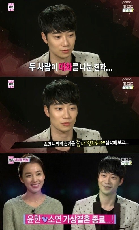 피아니스트 윤한이 '우결' 하차 이유를 밝혔다.이소연 윤한 커플은 15일 방송된 MBC '우리 결혼했어요 시즌4'(이하 우결)를 끝으로 7개월간의 가상 부부생활을 종료했다.이날 윤한은 첫 만남과 마찬가지로 피아노 연주를 하며 '그렇게 우린 만났지'를 불렀다. 이후 신혼집을 찾은 윤한 이소연 커플은 서로에게 하고 싶은 말을 손바닥에 적으며 마지막 인사를 했다.윤한은 제작진과의 인터뷰를 통해 "소연씨와 대화를 나눴는데 하차하기로 했다. 다시 현실로 돌아와 두 사람의 관계에 대해 좀 더 진지하게 생각해보는 시간을 갖기로 했다"고 털어놨다.이소연 역시 "이걸 언제까지 할 수 있는건 아니니까 받아들였다. 항상 그랬고 지금도 혼란스럽다"고 솔직하게 고백했다.윤한 '우결' 하차 이유를 접한 네티즌들은 "윤한 우결 하차 이유 진짜 마음에 둔거야?", "두 사람 잘 어울렸는데 아쉬워", "윤한 우결 하차 이유 이러다 이소연과 실제로 결혼하는 건 아닌지..", "그냥 두 사람 이어졌으면 좋겠다", "윤한 우결 하차 이유 의미심장해" 등의 반응을 보였다.[윤한 우결 하차 이유, 사진=MBC '우리 결혼했어요' 방송 캡처]