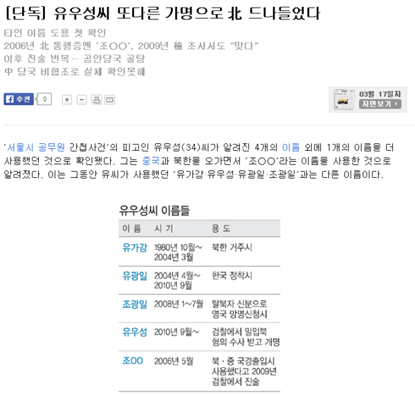 ‘서울시 공무원 간첩사건’의 피고인 유우성(34)씨가 알려진 4개의 이름 외에 ‘조○○’라는 이름을 1개 더 사용했던 것으로 확인됐다고 <세계일보>가 17일 보도했다.