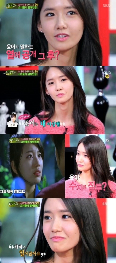 소녀시대 윤아가 공개 연애 중인 이승기를 언급했다.소녀시대는 17일 방송된 SBS '힐링캠프-기쁘지 아니한가'(이하 힐링캠프)에 출연해 지금까지 하지 못했던 이야기를 허심탄회하게 털어놨다.이날 '힐링캠프'에서 윤아는 이승기와 열애 보도에 대해 "새해엔 좋은 일이 많이 생기겠지 기대를 했는데 첫날부터 1년치 기사가 나가버리니까 굉장히 당황스러웠다"고 말했다.또한, 윤아는 MBC 드라마 '구가의 서'에서 이승기와 호흡을 맞춘 수지를 질투했다는 소문을 해명해 눈길을 끌었다.MC 이경규가 "드라마에서 포옹도 하고 키스도 하고 해서 그렇게 수지를 질투했다는데 사실이냐"고 묻자 윤아는 "전혀 없었다. 일이지 않냐. 어디서 그런 이야기가 나왔는지 출처가 궁금하다"며 억울함을 드러냈다.['힐링캠프' 윤아 수지 질투 해명, 사진=SBS '힐링캠프' 방송 캡처]
