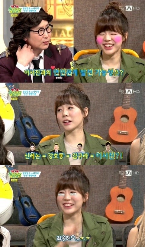 소녀시대 써니가 이서진에게 돌직구를 날렸다.지난 18일 방송된 엠넷 '비틀즈코드3D'에는 소녀시대 멤버 태연, 티파니, 효연, 써니와 임창정이 출연해 솔직한 입담을 뽐냈다.이날 신동엽은 써니를 이상형이라 밝혀왔던 이서진을 언급하며 "꽃보다 할배 이후 이서진과 문자를 주고 받고 연락도 하더라. 연인 발전 가능성은 없냐?"고 물었다.써니는 "나이 차이가 19살이다"고 답했고, 이를 들은 신동엽은 "사실 나와 강호동과 동갑이다"고 설명했다. 이에 써니는 "이서진 오빠가 김구라 오빠와 동갑이라고 하더라"고 말했다.이어 신동이 "나이 차이를 다 떠나서 이서진이 본인 스타일이냐?"고 묻자 써니는 몸 둘 바를 모르며 "죄송해요"라고 밝혀 웃음을 자아냈다'비틀즈코드' 써니 이서진 언급을 접한 네티즌들은 "써니 이서진 언급 서운하겠다", "비틀즈 코드 써니 너무 솔직하네", "써니 이서진 언급 나이 차이가 심하게 나긴했어", "비틀즈 코드 써니 이서진 반응이 궁금해", "써니 이서진 언급 실망했겠다" 등의 반응을 보였다.[비틀즈코드 써니 이서진 언급, 사진=Mnet '비틀즈코드 3D' 방송 캡처]