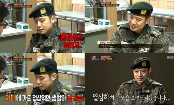 배우 천정명이 팔 부상으로 맹호부대 합류가 불발되며 결국 퇴소했다.지난 23일 방송된 MBC '일밤-진짜사나이'에서는 배우 천정명이 7년 만에 훈련소에 재입소하는 모습이 그려졌다.이날 김수로, 서경석, 샘 해밍턴, 박형식, 박건형, 케이윌, 헨리 등 멤버들은 맹호부대 전차대대에 입소했다. 김수로는 모든 멤버들이 모인 자리에서 "안 좋은 소식인데 천정명 이병이 팔을 다쳐 못 온다"고 전했다.천정명은 자대전입 신체검사에서 영화 촬영 준비 중 입은 왼쪽 팔 부상으로 6주간 보호대를 착용해야 했다. 특히, 그는 팔깁스를 풀고 훈련을 소화했지만 위험하다는 군의관의 진단 하에 자대배치 불가 판정을 받았다.천정명은 "여기 오기까지 많은 준비를 했다. 의욕이 너무 앞서는 바람에 속상한 마음이다"라며 "늦게 입소한만큼 끝까지 하고 싶었는데 그러지 못해 아쉽다"고 밝혔다.이어 "기대에 미치지 못해 너무 죄송스럽다. 이걸로 끝나는 게 아니니까 복귀한 후에는 정말 열심히 하겠다. 몸이 닿는 데까지 최선을 다해 뛰어보고 싶다"고 각오를 다졌다.[천정명 자대배치 불가, 사진=MBC '진짜사나이' 방송 캡처]