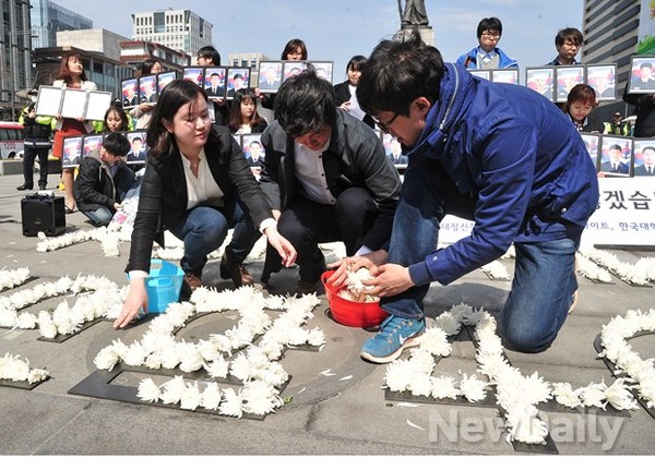 미래를 여는 청년포럼 등 청년단체 6곳이 주최하는 [천안함 폭침 4주기 추모행사]가 24일 정오 서울 광화문 이순신 동상 앞에서 열렸다.이날 행사에서는 다가오는 26일, 천안함 사건 4주기를 맞아 천안함 46용사의 희생과 애국심을 기리기 위한 추모의 국화꽃 퍼포먼스가 진행됐다.