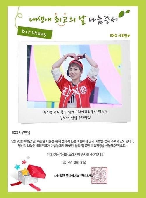 그룹 엑소(EXO)의 멤버 시우민이 25번째 생일을 맞아 팬들로부터 의미 깊은 선물을 받았다.26일 국내 포털사이트에는 시우민이 검색어로 등장해 의아함을 자아냈다. 이는 시우민 생일을 맞아 팬들이 홍보전을 치열하게 전개하고 있기 때문이다.팬들은 이날 0시부터 시우민의 생일을 축하하고 있으며, 이에 실시간 검색어 1위를 차지하기도 했다. 시우민은 1990년 3월 26일 생으로 올해 25살이 됐다.온라인상에는 시우민 생일 축하 광고가 부착된 위치와 기간 등을 정리한 지도가 등장하는가 하면, 팬들은 SNS를 이용해 시우민 생일 포스터 나눔 행사, 시우민 생일 지하철 광고, 시우민 사진 주고받기 등 각종 행사를 펼치고 있다.특히, 시우민 이름으로 굿네이버스 인터내셔날에 1000만원을 기부했다. 이 함께 팬들은 중국 사막에 나무 심기 운동을 펼치고 있는 '미래숲'에도 기부 운동을 벌이고 있다.한편, 시우민은 그룹 엑소의 맏형이자 엑소-M의 멤버로 활동 중이다. 엑소는 오는 27일 엑소의 모습이 담긴 DVD '엑소의 퍼스트박스'(EXO’s FIRST BOX)를 출시한다.[엑소 시우민, 사진=온라인 커뮤니티]