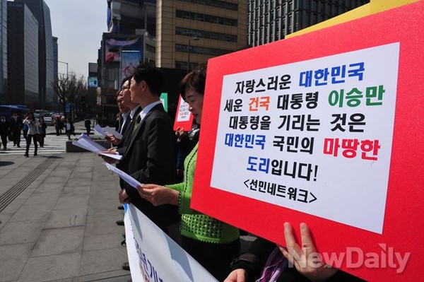 40대 기독교인들이 주축인 <선민네트워크>가 26일 오후 서울 여의도 광화문에서 이승만 대통령 탄생 139주기를 맞아 [건국대통령 이승만 대통령 동상 건립을위한 대국민 청원]기자회견을 가졌다.