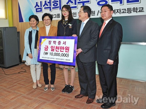 이날 심석희는 세화여고 학생들의 열화와 같은 환호 속에 장학금 수여식을 마쳤으며,