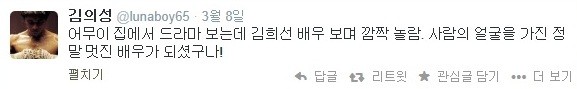 김의성은 지난 8일 자신의 SNS에 "어머니 집에서 드라마 보는데 김희선 배우 보며 깜짝 놀람. 사람의 얼굴을 가진 정말 멋진 배우가 됐구나"라고 언급하며 '참 좋은 시절'을 이끌고 있는 김희에게 더할 나위 없는 칭찬을 건넸다.