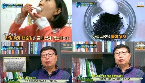 바질씨앗 효능에 대한 관심이 집중되고 있다.지난 27일 방송된 MBN '천기누설' 해독 다이어트 특집에서는 바질씨앗을 먹고 출산 후 체중 감량에 성공한 한 주부의 사연이 공개됐다.이날 주부 정민영씨는 "바질씨앗을 식사 30분 전 물과 함께 한 숟갈씩 먹는다. 바질씨앗에 있는 식이 섬유소가 우리 몸에 들어오면 40배 정도로 늘어나 조금만 먹어도 포만감을 느낄 수 있다"며 한 달만에 9kg 감량에 성공했다고 밝혔다.한대 식품영양학과 김영성 교수는 바질씨앗 효능에 대해 "바질씨앗에는 비타민 E, 항산화제인 토코페롤, 비타민, 무기질이 다량 함유돼 있다"고 설명했다.이어 "비타민 외에도 우리 몸에 필요한 무기질들이 많이 들어 있다'며 "특히 수용성 식이섬유소가 들어있어 독소들을 제거하는 디톡스 효과가 아주 뛰어난 식품"이라고 덧붙였다.바질씨앗 효능을 접한 네티즌들은 "바질씨앗 효능 나도 이제 먹어야지", "별게 다 있네", "바질씨앗 효능 이렇게 좋은 걸 왜 이제야 알았을까", "바질씨앗 맛이 궁금해", "바질씨앗 효능 보고 사람들 많이 찾겠다" 등의 반응을 보였다.[바질씨앗 효능, 사진=MBN '천기누설' 방송 캡처]