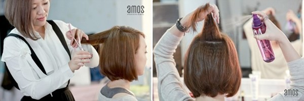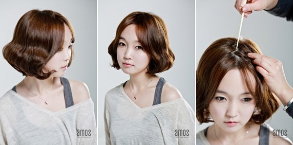 고데기나 매직기로 가르마 시작 부분부터 C자 모양으로 당기다가 눈 옆선에서 뒤집어 올려