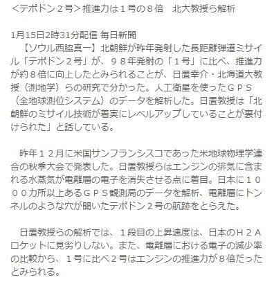 당시 분서결과에 따르면 북한이 2009년 4월 발사한 ‘대포동 2호’의 추진력은 1998년 발사한 ‘대포동 1호’의 약 8배(하단 日語 원문자료 참고)에 달하는 것으로 나타났다.