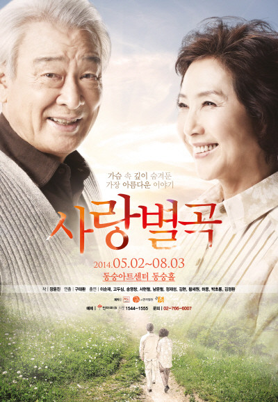 2014 '연극열전5' 첫 번째 작품 '사랑별곡'이 이순재와 고두심의 포터를 공개했다공개된 포스터에는 주인공 순자 역을 맡은 고두심과 순자 남편 역할을 맡은 이순재가 환한 미소를 짓고 있다'사랑별곡'은 최근 tvN '꽃보다 할배'로 젊은 세대와 더욱 가까워진 이순재, '국민 어머니'라는 칭호를 얻으며 국내 유일 방송 3사의 연기 대상을 휩쓴 배우 고두심이 처음으로 부부 호흡을 맞춰 화제를 모으고 있는 작품이다.'사랑별곡'은 아름다운 한편의 시와 같은 노부부의 사랑 이야기를 담은 연극이다충남 서산의 한 시골 장터를 배경으로 삶의 고단함을 안고 사는 40대부터 죽음과 마주한 80대까지 다양한 등장인물들의 삶을 통해 한국 특유의 정(精)과 한(恨)을 뭉클한 감동으로 그려낸다.'사랑별곡' 포스터를 접한 네티즌들은 "부모님 보여드리고 싶은 연극이다", "두 분 잘 어울려요", "이순재 고두심 연기 호흡 기대되네요", "시아버지와 며느리가 부부로?" 등의 반응을 보였다.한편, 연극 '사랑별곡'은 오는 5월 2일부터 대학로 동숭아트센터 동숭홀에서 공연된다.