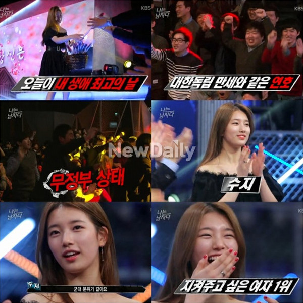 수지가 인사를 하자 남자들은 하나같이 "말을 하고 있어!"라며 흥분을 감추지 못했다. 수지는 방청객들의 열렬한 환호에 "군대 분위기 같다"라고 소감을 밝혔다.