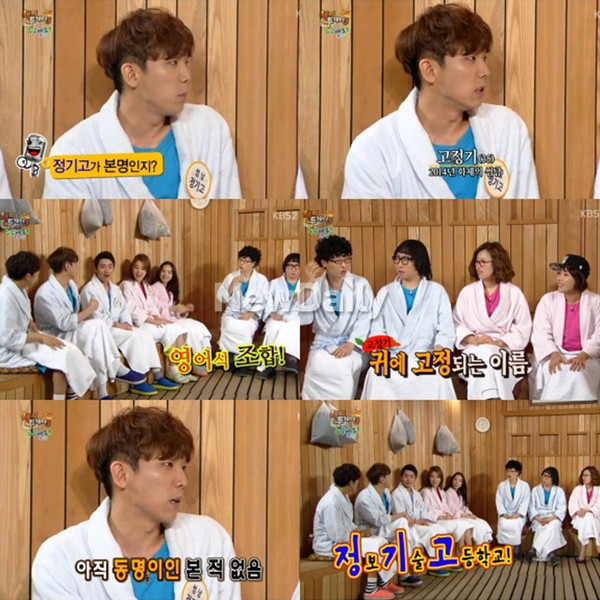 가수 정기고가 본명을 공개했다.지난 10일 방송된 KBS 2TV '해피투게더 시즌3'에서는 '누구세요' 국악소녀 송소희, 전 프로게이머 홍진호, 썸남 정기고, 전 아나운서 김성경, 개그맨 서태훈이 출연해 솔직한 입담을 뽐냈다.이날 MC 유재석이 본명이 맞냐고 질문하자 정기고는 "본명은 고정기다. 성만 영어식으로 뒤로 했다"고 밝혔다.이에 함께 출연한 홍진호는 "본명이 귀에 박힌다"라고 말했으며, 유재석은 "고정기라는 이름은 귀에서 떠나질 않는다"고 반응했다.정기고는 "아직 고정기라는 동명이인을 본 적 이 없다"면서 예명 '정기고'에 대해 "정보기술고등학교를 줄인 말 같다는 말을 많이 듣는다"고 털어놔 웃음을 자아냈다.[정기고 본명, 사진=KBS2 '해피투게더' 방송 캡처]