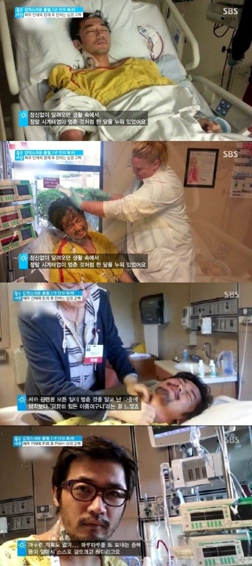 배우 안재욱의 지주막하출혈 투병 당시 모습이 공개됐다.안재욱은 11일 오전 방송된 SBS '좋은아침'에 출연해 지주막하출혈 수술을 받은 후의 근황과 함께 수술 당시 심경을 고백했다.이날 안재욱은 "수술 당시 배우였는데 머리를 절개해야 한다는 말에 사실 삶을 포기했었다"며 "우리나라 돈으로 수술비가 4억원 이상 나왔다. 지나친 액수 때문에 생명을 포기할 수 없는 상황이었다"고 밝혔다.또한, 안재욱은 "정신없이 달려오던 생활 속에서 정말 시계태엽이 멈춘 것처럼 한 달을 누워 있었다. 내 주위의 모든 것들이 멈췄다. 그게 얼마나 아픈 일인지 깨달았다"고 말했다.이어 "하루 하루 계획없이 보내던 중 몸이 스스로 걸으려 하더라. 내가 얼마나 굉장한 행운을 받았는지 알게 됐다"고 덧붙였다.이후 방송에는 미국의 한 병원에 입원한 안재욱의 모습을 공개해 눈길을 끌었다. 특히, 지주막하출혈 수술 후 초췌해진 얼굴과 아픔에 고통스러워하는 안재욱의 모습이 안타까움을 자아냈다.[지주막하출혈 안재욱, 사진=SBS '좋은 아침' 방송 캡처]