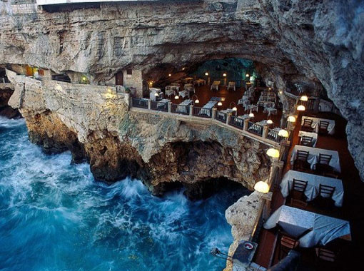 바다 절벽에 위치한 레스토랑이 등장했다.최근 한 온라인 커뮤니티에는 '바다 절벽 레스토랑'이라는 제목으로 한 장의 사진이 올라와 네티즌들의 눈길을 끌고 있다.바다 절벽 레스토랑은 이탈리아 풀리아에 위치한 한 호텔의 시설로 알려졌다. 바닷가에 위치한 호텔 측은 주위 경관을 최대한 즐길 수 있도록 절벽 동굴 내부에 레스토랑을 만들었다.특히, 바다 절벽 레스토랑은 은은한 조명과 함께 파도소리를 즐기며 식사를 할 수 있으며, 날이 저물고 조명이 켜진 후의 야경은 황홀함을 선사한다.'바다 절벽 레스토랑' 사진을 본 네티즌들은 "바다 절벽 레스토랑 정말 멋지다", "분위기로는 세계 제일인 듯", "바다 절벽 레스토랑 직접 가보고 싶어", "바다 절벽 레스토랑 로맨틱해", "바다 절벽 레스토랑 밥 먹다가 물벼락 맞겠다" 등의 반응을 보였다.[바다 절벽 레스토랑, 사진=온라인 커뮤니티]