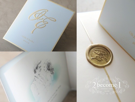 신랑과 신부의 이니셜이 입체감 있는 금빛의 '호일 스탬핑'으로 새겨져 있고, 신랑-신부가 마주보고 있는 우아한 그림이 내지에 그려져 눈길을 끌고 있다. 봉투는 이니셜로 디자인된 금빛 실링스탬프로 봉해져 깔끔한 느낌을 더하고 있다.