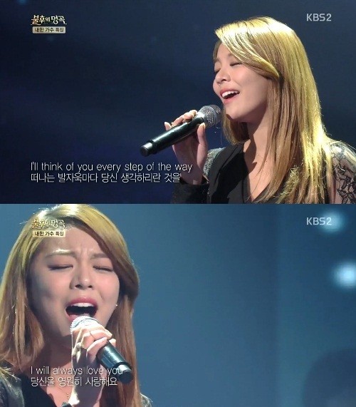 12일 방송된 KBS 2TV '불후의 명곡'에서 에일리는 故 휘트니 휴스턴의 명곡 'I Will Always With You'를 선곡, 열창했다.