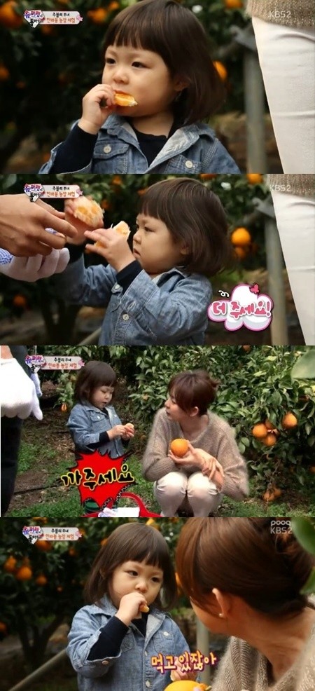 추사랑이 한라봉 먹방을 선보였다.지난 13일 방송된 KBS 2TV '해피선데이-슈퍼맨이 돌아왔다'에서는 제주도 한라봉 농장에 찾은 추성훈 가족의 모습이 그려졌다이날 추성훈 야노시호 부부는 과일을 좋아하는 추사랑을 위해 한라봉 농장을 방문, 한라봉 따기 체험에 나섰다. 한라봉 수확을 마친 뒤 추성훈 가족은 나무에서 갓 딴 신선한 한라봉을 먹었다.야노시호는 "신선하다. 정말 맛있다"라며 한라봉 맛에 감탄했고, 추성훈은 "날거 먹는 기분이야"라고 말했다.추사랑 역시 한라봉을 양 손에 쥐고 엄마 야노시호에게 "까달라"고 부탁했다. 추사랑은 한라봉을 먹으면서도 "더 주세요"라고 식탐을 보이며 야무진 한라봉 먹방을 선보였다.추사랑 한라봉 먹방을 본 네티즌들은 "추사랑 한라봉 먹방 귀여워", "추성훈 가족 단체 먹방이네", "추사랑 한라봉 먹방 나도 먹고 싶어", "추사랑 맛있게도 잘 먹어", "추사랑 한라봉 먹방 뭘 해도 사랑스러워" 등의 반응을 보였다.[추사랑 한라봉 먹방, 사진=KBS2 '슈퍼맨이 돌아왔다' 방송 캡처]
