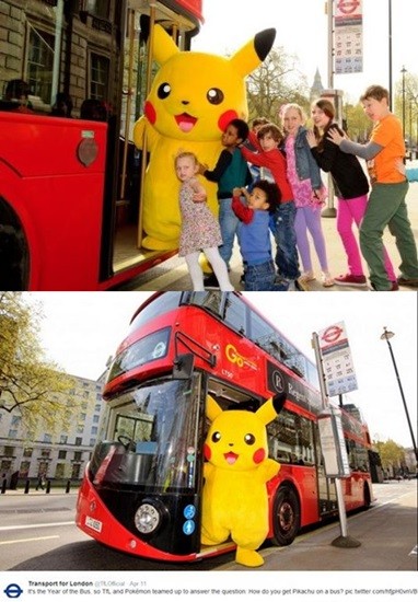 버스 타는 피카츄가 등장했다.지난 11일(현지시각) 런던 교통공사는 공식 트위터에는 "피카츄가 버스에 탄다면 어떨 것 같냐?"라는 질문과 함께 피카쥬의 사진이 올라왔다.공개된 사진은 런던 2층 버스에 피카츄가 타고 있는 모습이 담겨 있다. 버스 타는 피카츄 사진은 '버스의 해'를 기념해 영국 런던의 교통 당국이 진행한 이벤트인 것으로 알려졌다.사진 속 피카츄는 런던의 명물인 빨간 2층 버스에 한 발을 걸친 채 손을 흔들고 있는 모습이다. 또 다른 사진에서는 몸집이 커 버스 입구를 통과하지 못하자 아이들이 피카츄를 태우려고 밀고 있다.버스 타는 피카츄 사진을 접한 네티즌들은 "버스 타는 피카츄 귀여워", "타요 버스랑 느낌이 비슷해", "버스 타는 피카츄 합성이야?", "우리나라도 이런 이벤트 강추!", "버스 타는 피카츄 아이들이 좋아하겠다" 등의 반응을 보였다.[버스 타는 피카츄, 사진=온라인 커뮤니티]