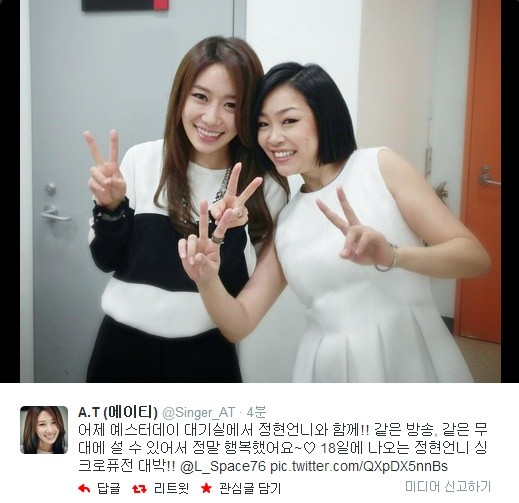 프로듀싱 그룹 '팀 89'와의 콜라보레이션 앨범 '싱크로퓨전(SYNCROFUSION)' 공개를 앞둔 가수 박정현이 짧아진 단발머리 컷을 공개해 화제다.박정현의 소속사 블루프린트뮤직의 후배 가수 AT는 최근 자신의 공식 SNS에 박정현과 함께 찍은 인증샷 한 장을 올렸다. 이는 모 음악 프로그램에 출연한 두 사람이 대기실에서 촬영한 기념 사진.
