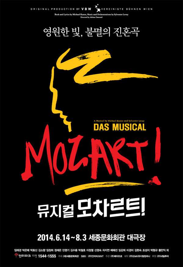 뮤지컬 ‘모차르트!’가 티켓 오픈과 동시에 단숨에 예매율 1위에 등극했다.뮤지컬 ‘모차르트!’는 2014년 완전히 새로워지는 작품과 임태경, 박은태, 박효신 등 화려한 캐스팅으로 기대감을 모으며 티켓 예매 전쟁을 예고한 바 있다.2년 동안 ‘모차르트!’가 돌아오길 손꼽아 기다리던 팬들은 “손 떨리는 피켓팅(피 터지는 티켓팅의 줄임말. 치열한 티켓팅을 의미하는 신조어)이었다” “티켓팅 한 번 하고 온 몸에 기운이 다 빠져 나갔다” “간신히 예매했다. 팬미팅급의 티켓팅” 등 힘들었던 예매 후기를 남기며 ‘모차르트!’의 티켓파워를 실감케 했다.2014년 ‘모차르트!’는 각색, 연출, 무대 등 대대적인 수정 작업을 거쳐 한층 더 치밀해진 스토리와 밀도 높은 구성 등 완전히 새로워진 모습으로 돌아온다. 감성연출 아드리안 오스몬드를 비롯한 정승호 무대디자이너, 김지현 음향디자이너, 최혜진 소품디자이너 등 내로라하는 스태프들이 대거 합류했다.아울러 김문정 음악감독, 이란영 안무가, 한정임 의상디자이너, 김유선 분장디자이너, 고희선 조명디자이너, 송승규 영상디자이너 등 기존의 스태프들과 함께 역대 최고의 뮤지컬 ‘모차르트!’를 선보일 예정이다.임태경, 박은태, 박효신, 김소향, 임정희, 정재은, 민영기, 김수용, 박철호, 이정열, 신영숙, 차지연 등 한 무대에서 좀처럼 만나보기 힘든 초호화 캐스팅으로 더욱 기대를 모으고 있는 뮤지컬 ‘모차르트!’는 오는 6월 14일부터 8월 3일까지 세종문화회관 대극장에서 공연된다.인터파크 티켓 예매사이트에서 예매 가능하며, 티켓 가격은 VIP석 13만원, R석 11만원, S석 9만원, A석 7만원, B석 5만원, C석 3만원으로 4월 30일까지 조기 예매자에 한해 20% 할인을 제공한다.
