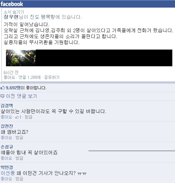 "나 아직 안 죽었어!" 실종자 흉내낸 거짓 SNS 메시지까지▲ 17일 오후 전남 진도 해상에서 침몰한 여객선 세월호 실종자 가족들이 모여 있는 진도 실내체육관에서 한 실종자 가족이 공개한 페이스북 글. 이 글은 실종된 안산 단원고등학교의 한 학생이 이날 오전 페이스북에 올린 글로 SNS와 블로그 등을 통해 급속히 전파되고 있다. ⓒ 연합뉴스내 딸아! 내 아들아! 내 동생아!