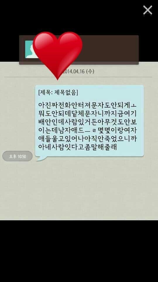 아 진짜 전화 안터져 문자도 안되게ㅗ 뭐도 안되데닽체 문자니까 지금 여기 배 안인데 사람있거든 아무것도 안보이는데 남자애드ㅡㄹ몇몇이랑 여자애들울고 있어 나 아직 안죽었으니까 아 네 사람 잇다고 좀 말해줄래