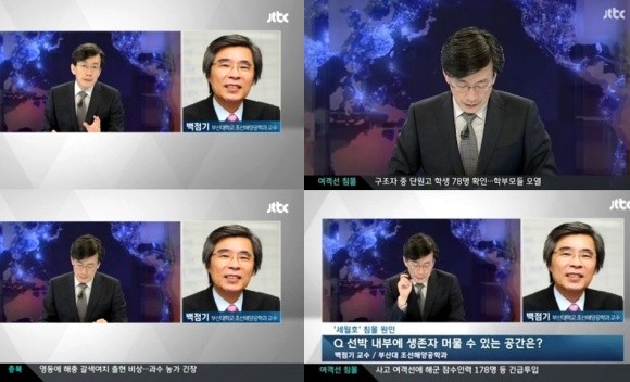 손석희 앵커는 지난 16일 JTBC '뉴스9' 방송에서 세월호 침몰 사고 소식을 전하면서 부산대 조선해양공학과 백점기 교수와 전화 인터뷰를 진행했다.