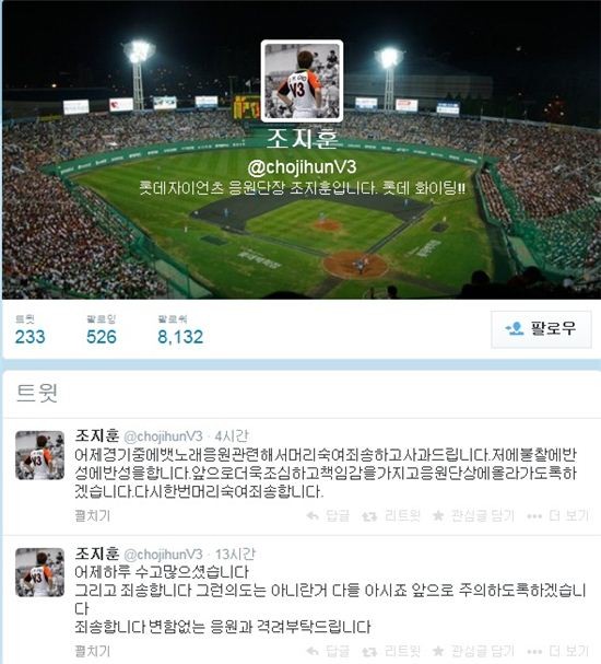 롯데 자이언츠 조지훈 응원단장이 응원 논란에 대해 거듭 사과의 뜻을 밝혔다.16일 진도 여객선 세월호 침몰 소식에 한국야구위원회(KBO)는 사회적인 애도 분위기에 동참하기 위해 각 구단에 단체응원을 유도하는 엠프 응원, 이닝간 교체타임에 진행되는 이벤트 등을 자제해달라고 공식 요청했다.하지만 롯데 자이언트 조지훈 응원단장은 16일 부산 사직구장에서 열린 '2014 한국야쿠르트 세븐 프로야구' 롯데 자이언츠와 NC 다이노스 경기에서 앰프를 사용하고 메인 응원가인 '뱃놀이'를 부르도록 유도해 논란이 됐다.조지훈 단장은 경기 종료 후 자신의 트위터에 "어제 하루 수고 많으셨습니다. 그리고 죄송합니다. 그런 의도는 아니란 거 다들 아시죠? 앞으로 주의하도록 하겠습니다. 죄송합니다. 변함없는 응원과 격려 부탁드립니다"라는 글을 게재했다.하지만 "사과에 진정성이 없다"는 질타를 받으며 비난이 거세졌다. 이에 조 단장은 "어제 경기 중에 뱃노래 응원 관련해 머리숙여 죄송하고 사과드립니다. 저의 불찰에 대해 반성을 하고 있습니다. 앞으로 더욱 조심하고 책임감을 가지고 응원단상에 올라가도록 하겠습니다. 다시 한번 머리 숙여 죄송합니다"라며 재차 사과했다.해당 소식을 접한 네티즌들은 "세월호 침몰 사고를 가볍게 생각한 것 같다", "세월호로 전 국민이 가슴을 졸이고 있는데 경솔했다", "도대체 무슨 생각으로..", "세월호 침몰 사고로 모두가 비통한 분위기인데 너무 했다", "KBO 요청에도 응원하다니 징계 받아야해" 등의 반응을 보였다.[세월호 침몰 사고 조지훈 응원 논란, 사진=조지훈 트위터]